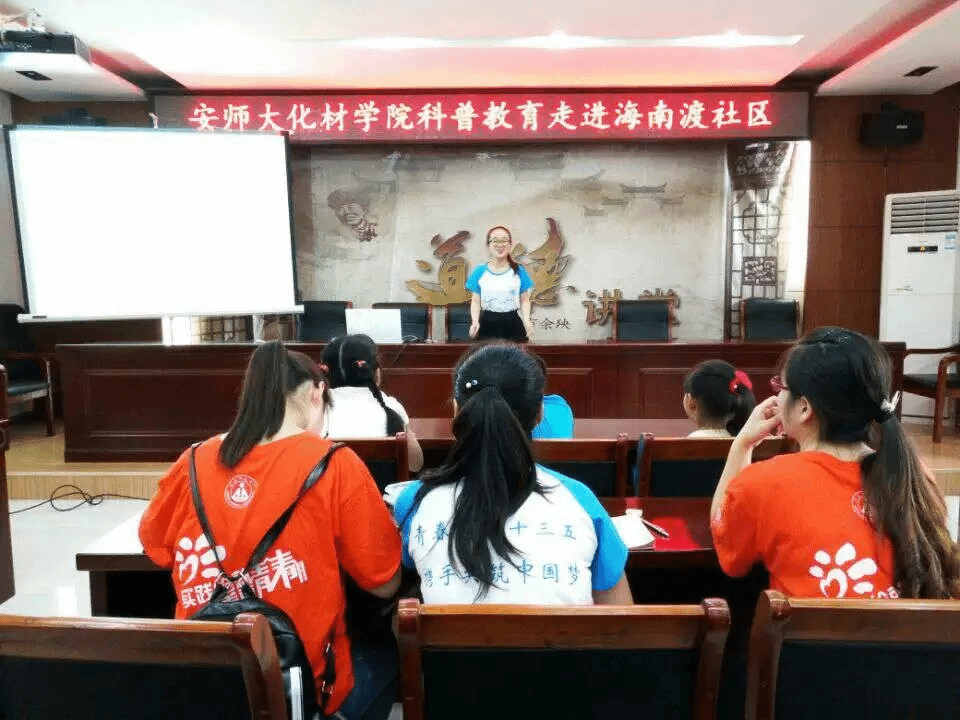 、安徽工程大学、南医学院等高校、中山路步行街、花园社区、镜湖公园等地开展随机调查和街访,并向大家宣传讲解化学核心价值,共收集有效问卷1000余份,社会调查取得良好开端。7月5日,实践团队走进花园社区开展主题宣讲宣教。宣讲队员们精心准备,联合社区小朋友共同打造了一堂充满趣味的科学小课堂。志愿者们通过讲述“钻石失窃”、“鸡蛋里藏情报”、“波尔的奖章回来了”等著名的化学小故事,播放趣味化学实验视频,让小朋友们对科学课堂充满了兴趣。在故事的渲染和知识的熏陶中,小朋友们更加明白化学与生活的密切联系,进一步认识到化学在社会生产和人类生活中发挥的巨大作用。志愿者们在传授化学专业知识、宣传化学核心价值、树立化学正面形象的实践过程中,深刻体会和感受到作为一名化学学科的学习者和传承者肩上的责任重大。