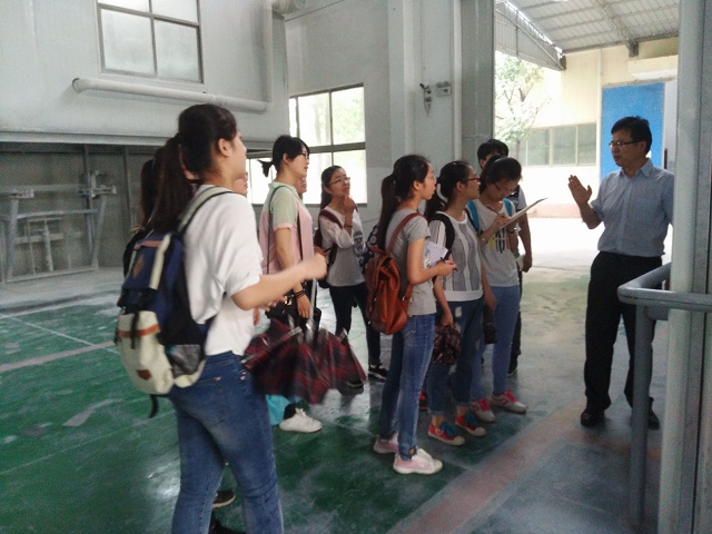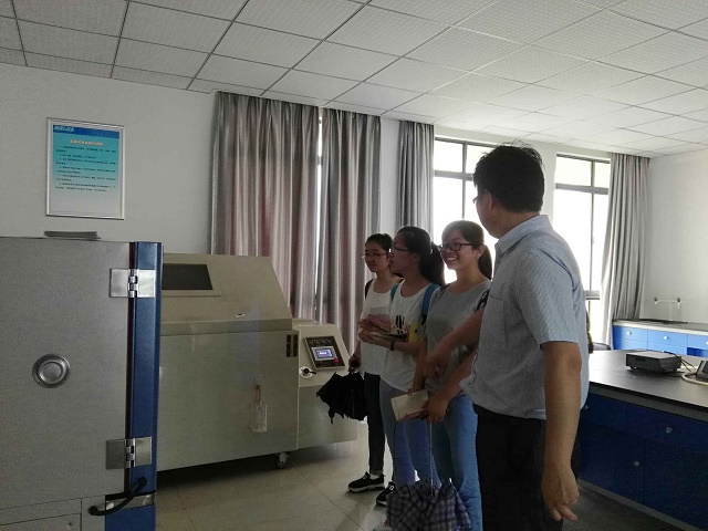 随后,在丁部长的带领下,同学们参观了工厂内部环氧树脂、聚酯树脂等粉末涂料生产的相关过程,负责人指出该粉末涂料利用甲苯循环利用,其主要酯化反应过程成本低,污染小,是现今涂料产品的主流。之后,杨总带领我们参观涂料树脂实验室、漆膜理化性能检测室、涂料助剂实验室等,他拿出的一个个五颜六色的涂装样品让队员们感到惊喜,而研发室中的气液相色谱仪、差示扫描量热仪、高低温交变湿热试验箱以及盐雾腐蚀试验箱则更为直观地让我们了解到化工生产的仪器设备,认识到扎实学习专业知识的必要性,及产学研相结合的重要性。