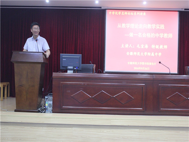 来自芜湖市第十二中学的邓仪老师以“略谈中学化学课堂教学”为主题,深入的分析了如何更好的完成一节课,从备课、上课到课后的反思,邓老师都一一伴以实例详尽的阐述了。并且,邓老师还分析了当下的化学教学趋势,如微课已经成为教师必不可少的一门技能。最后,邓老师以自己三十多年的教学经验为例,向我们讲解了如何在课堂上更好的与学生互动。整个报告过程中,两位老师都以生动幽默的方式进行,使得大家笑声不断。同学们也学到了很多,短短两个多小时,受益匪浅。