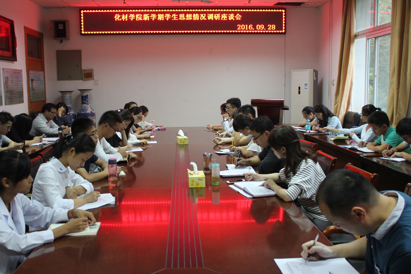 )为切实掌握新学期学生思想状况,了解学生学习生活动态,9月29日下午,学院在经过前期班级调研、寝室座谈的基础上,召开新学期本科生思想情况院级调研座谈会。院党委书记汪俊武、副书记余妍霞、教学副院长张小俊、材料化学系副主任沈业青和全体辅导员参加了座谈会。学院各班级30余名学生代表以座谈会的形式汇报了班级同学在思想、学习和生活上的主要情况。