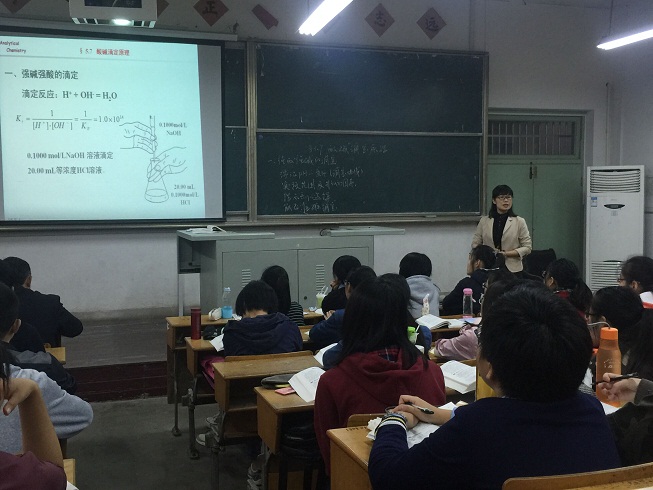 阚显文教授主讲的《酸碱滴定原理》校级公开课。校督导团、学院领导和部分中青年教师参加了本次观摩活动。