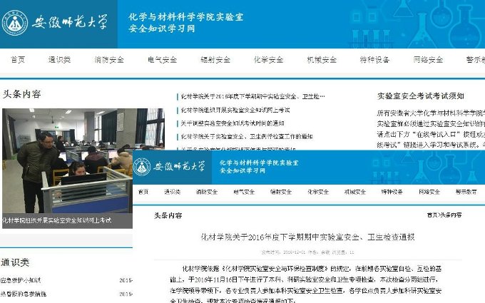 实验安全网”以及“实验室安全知识教育考试系统”,师生可以通过学院网站进入该系统学习,学习内容既涉及化学专业类,也涵盖了通识类等多项内容。同时要求本科生、研究生必须以满分成绩通过安全知识考试,方可进入实验室开展实验,该规定极大地增强了学生实验操作的规范性。