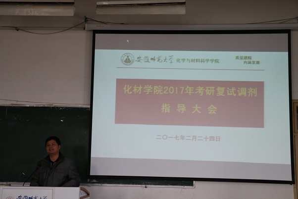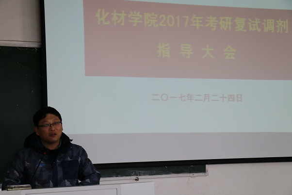 在教学楼1410教室举办了考研复试调剂指导大会,学院教学院长张小俊、科研院长周双六、材料化学系主任王正华、化学工程与工艺系副主任周映华、毕业班辅导员、2017届考研学生参加了指导会。会议由学院党委副书记余妍霞主持。