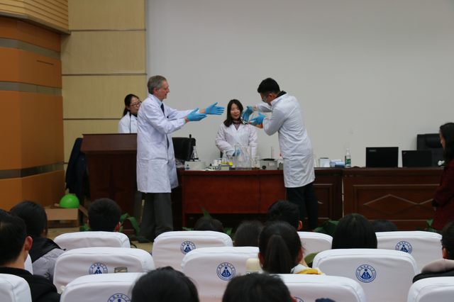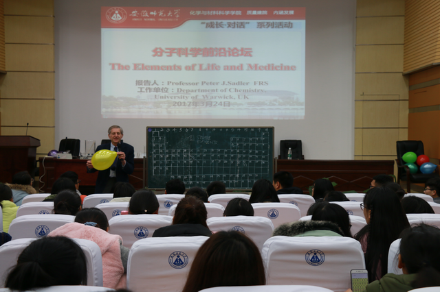 Peter J. Sadler教授作了题为“The Elements of Life and Medicine”的全英文讲座。Peter J. Sadler教授经过前期的精心准备,采取现场实验演示、板书讲解、模型解说等多种方式,从学生熟悉的元素周期表入手,深入浅出地为学生描绘了一幅奇妙的元素风景画。