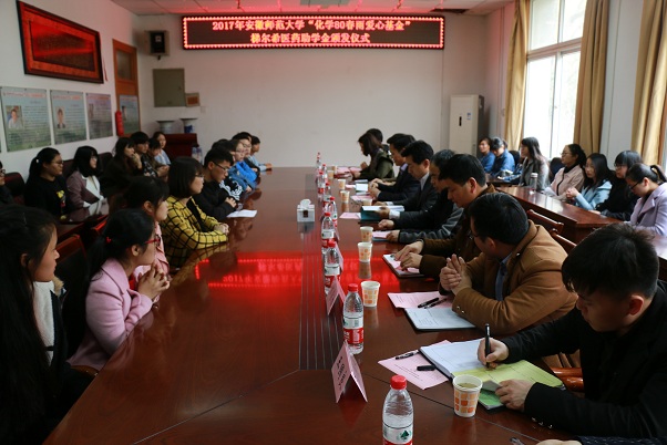 颁发仪式上,郑金泽宣读了梯尔希医药助学金颁发决定,并鼓励全体受助学子勤俭节约、努力学习,力争在品德和学业上取得更大进步。他希望广大同学能够积极进取、求实创新,争做学院优秀学生的典范。芮彬云代表资助人为受助学子颁发了助学金,他鼓励受助学生要自强不息,不断进取。15级材料化学专业董伟同学代表全体受助学生表达了对爱心助学金资助人诚挚的感谢,他表示自己会珍惜来之不易的学习机会,志存高远、自强自立,用过努力赢得一个精彩的大学生活。