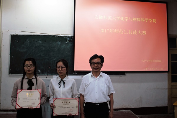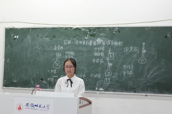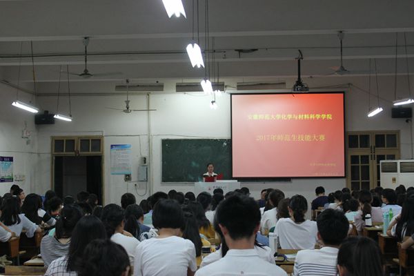 于2017年5月17日晚7点在赭山校区教学楼1410教室展开了“名师化材”师范生技能大赛决赛。本次比赛邀请化学课程与教学论研究生导师熊言林老师,化学系副主任、化学课程与教学论研究生导师孙影老师、化学系专业教师程瑶琴老师担任评委。二、三年级的近200名同学现场观摩了此次比赛。