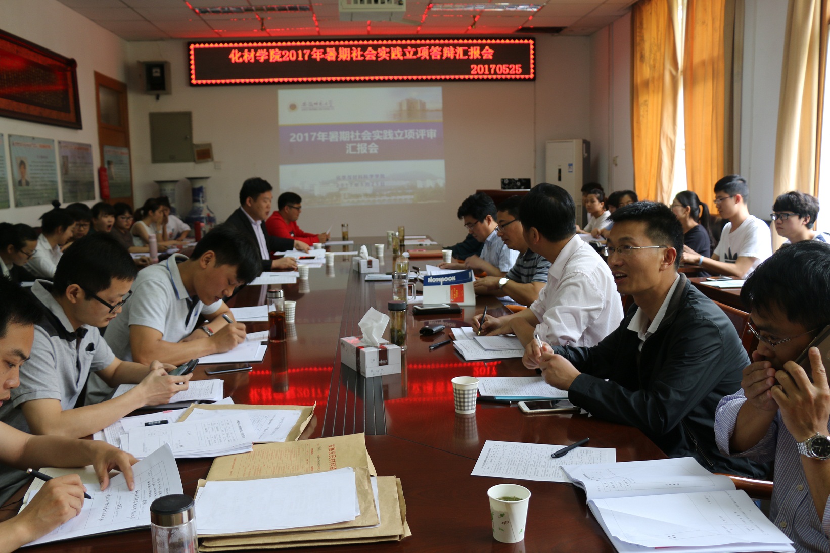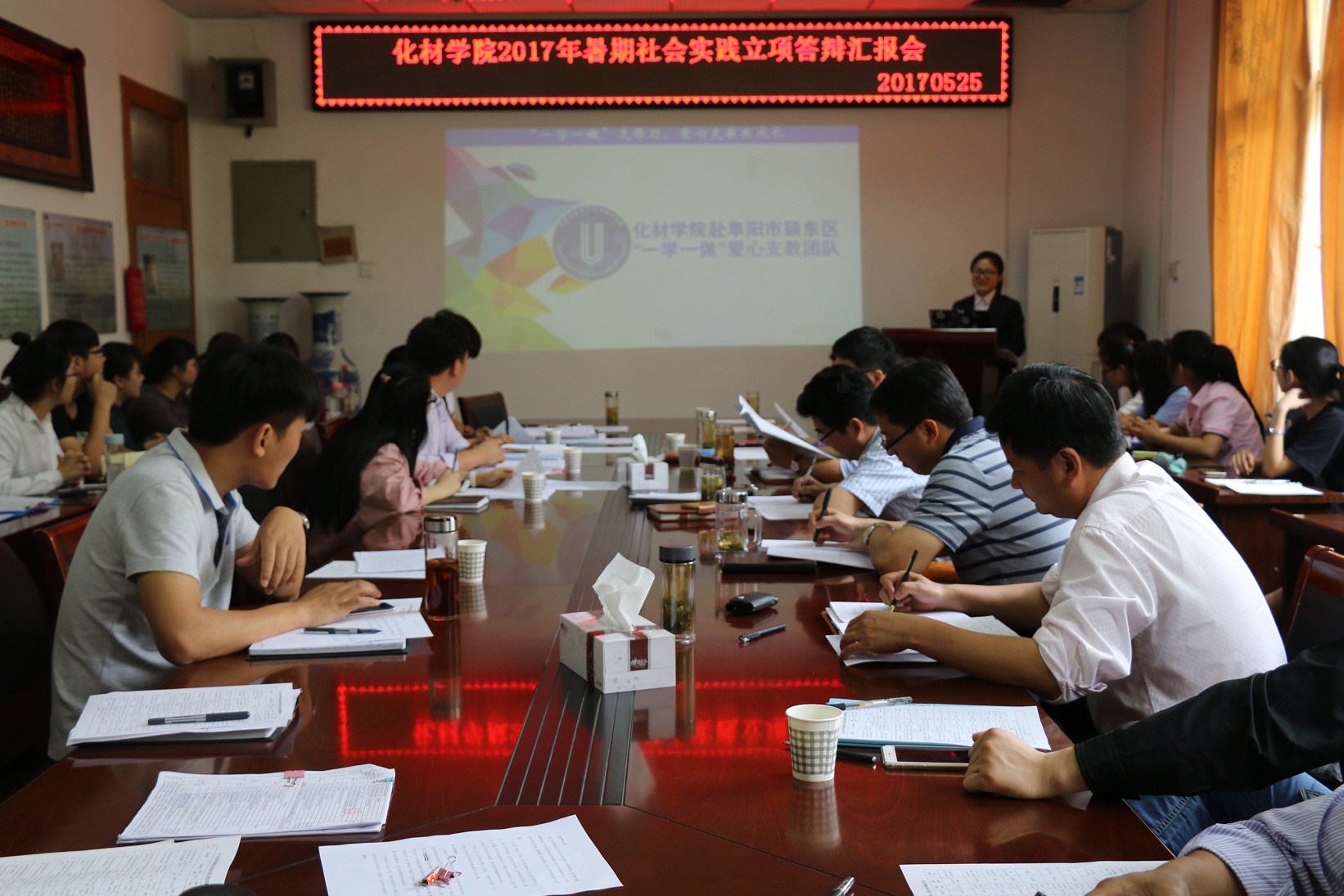 在会议室举行了2017年暑期社会实践重点团队立项评审答辩会。学院党委书记汪俊武,院长高峰,党委副书记余妍霞,副院长刘桂云、张小俊、周双六,各系负责教师代表及全体辅导员担任答辩会评委。学院对37支团队经过方案遴选,共有14支优秀团队参与答辩。