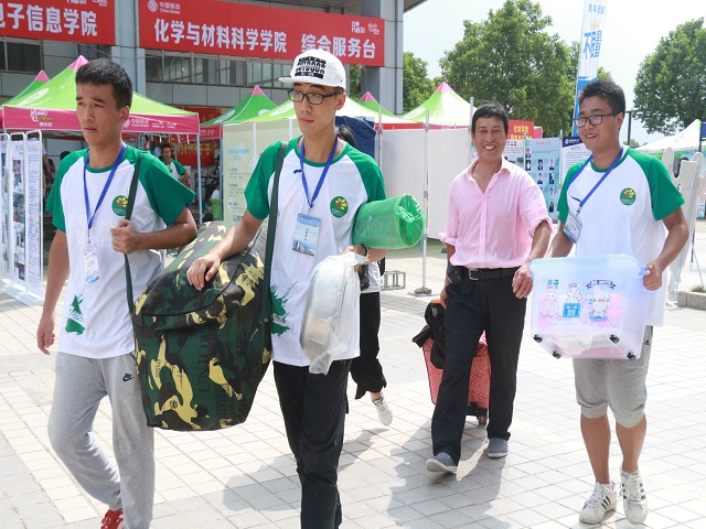 最后,就是学院的志愿者们,报名点、寝室来回奔走的绿色身影构成校园里最美的一道风景。志愿者们尽管大汗淋漓,仍然热情不减,引导新生报到、帮忙拎行李、领路寻找宿舍,新生与家长脸上真诚的笑容就是对志愿者们最好的褒奖。值得一提的是,学院今年精心从高年级遴选了60余名品学兼优的“第7号室友”,从迎新起就积极融入新生寝室,做他们熟悉校园生活的导游和灌注“正能量”的“中国好室友”。