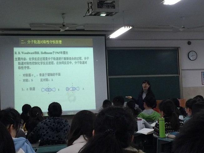 上课伊始,晏老师首先总结回顾了有机化学反应中涉及到的基本反应类型,分析对比了不同反应机理具有的典型特征,在此基础上自然引入新课“周环反应”。晏老师通过分析前线分子轨道的对称性,顺利引导学生掌握电环化反应分子的旋转关环方式,总结出反应条件与立体选择性之间的对应关系。在教学中,晏老师由理论到实例讲解,再到反应规律总结,从分析分子轨道的对称性着手,让学生从对称中体会美学在有机化学中的应用,从而使得学生将枯燥晦涩的抽象理论和空间想象变成了一种美的欣赏和享受。