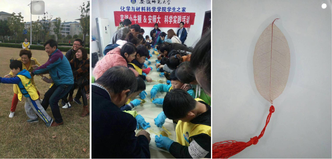 首先,江淮科普学校的科普志愿者们带领小朋友和家长前往师大草坪,组织小朋友们同家长一起参与拔河比赛,大汗淋漓之后,小朋友又专心致志听小牛顿科学馆的老师讲科学绘本故事。随后,老师和部员们带着小朋友们一起采摘树叶,并前往理科大楼参观化学实验室。实验室里,志愿者们认真热情地向小朋友们介绍各种实验仪器和药品,小朋友们带着好奇的心情专心听讲。最后,在实验室内,科普志愿者们手把手教小朋友们动手制作叶脉书签。期间,小朋友们和家长一同完成叶脉书签的制作,虽然过程复杂,但在小朋友们高度热情和志愿者“小老师”们的细心指导下,每个小朋友都制作出属于自己的“叶脉书签”。
