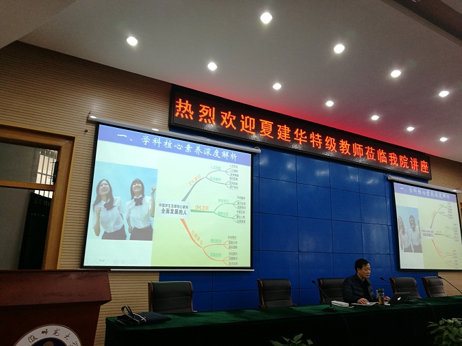 作题为《基于学科核心素养的中学化学教学》专题学术报告。报告会在安师大花津校区圆形会议中心举行,由化学系主任阚显文教授主持,2015、2016级化学专业师范生、化学教学论专业研究生及部分老师参加了此次报告会。