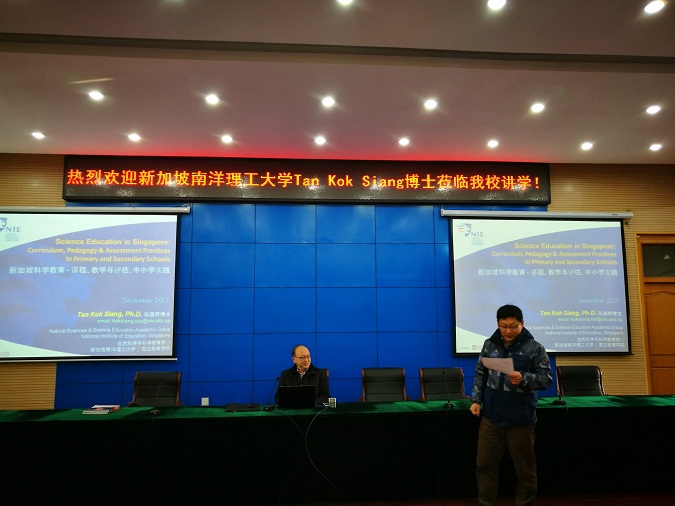 Tan Kok Siang博士的报告主题是“新加坡科学教育:课程、教学与评估、中小学实践”。报告分为三个方面,首先关于新加坡的科学教育体系、科学课程框架、学生科学学习以及评价体系。其次,在教学与学习科学方面,展示了典型的新加坡科学实验室以及户外科学学习活动。最后,在研究发展和创新方面,Tan Kok Siang博士通过实例阐释如何进行反思学习及开展STEAM课程(S指科学、T指技术、E指工程、A指艺术和M指数学)。随后,Tan Kok Siang博士与在座师生展开了积极交流,师生们踊跃发言,现场气氛活跃。本次学术报告历时两个小时,Tan Kok Siang博士的报告兼具学术性和指导性,开阔了化学专业师范生的国际视野,了解了国外科学教育前沿。