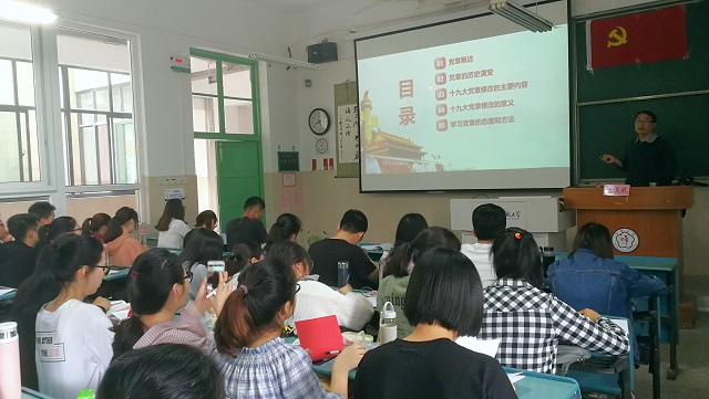 上午8点30分,《中国共产党章程》专题学习会正式开讲,学院党委书记汪俊武为全体学生党员们呈现了一场生动形象的党章历史与哲学之旅。简要地介绍完党章的定义以及重要意义与作用后,汪书记将我党从中共一大到十九大这九十多年风雨历程中党章的修订与变化为大家做了一一陈述。在陈述中。他着重指出党章的重大修订与其背后的历史背景间的联系,从而引出了在新时期的今天,中共十九大对党章修订的必要性与重要性。在谈到广大党员应当如何贯彻学习新党章时,汪书记结合自己的切身体会,对在座的全体学生党员们提出了三点希望与要求。他指出,我们广大的党员同志们在学习党章时,要“逐句学”,逐条逐句通读党章;要“对照学”,与以前的党章相对照;要“结合学”,与十九大报告相结合,与自身思想实际相结合,与党的初心与使命相结合,与自身岗位职责相结合。