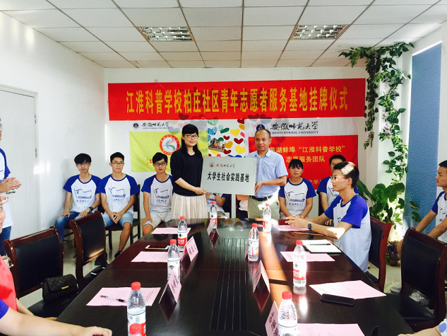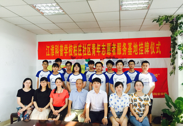 江淮科普学校与柏庄社区进行了青年志愿者服务基地的赠牌仪式。在会上,学院党委副书记余妍霞与澛港街道办事处副主任吴显启发言,表达了对青年志愿者基地建立的喜悦、对青年志愿者在社区服务活动的称赞。