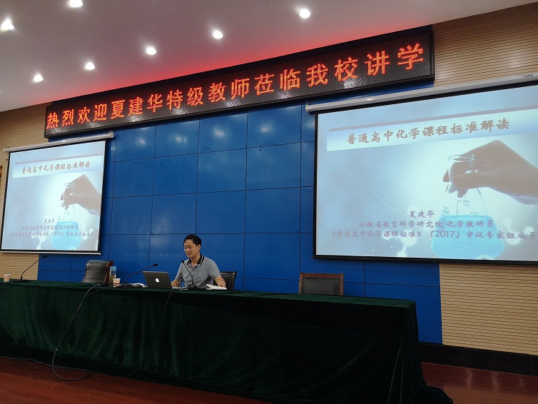 夏建华老师首先介绍了普通高中化学课程标准(2017版)的颁布情况及安徽化学高考的最新动态,从高中化学课程标准的六大亮点、从化学家的研究透视核心素养、化学学科核心素养深度解析以及基于核心素养的化学教学等四个方面全面解读了新课标,深刻分析了新课标与旧课标的异同点。对于新课标的六大亮点,夏老师分别从基本框架、课程结构、必修课程内容调整、化学学业质量内涵、命题原则与框架以及教、学、评一致性等几个方面来阐述了新课标的特色之处。最后夏老师依据化学学科核心素养的五个维度,通过真实的实验研究案例,提出化学研究与核心素养的关系。夏老师不仅从理论视角剖析了化学新课标中的核心素养,同时通过丰富的教学实例,理论与实践相结合,使在座师生对新课标及新高考有了更深刻的认识和思考。