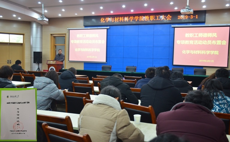 构建师德建设长效机制实施办法》等文件精神。针对此次师德师风专项教育活动,学院还专门编印了《教职工师德师风建设专项教育活动学习资料汇编》发给每个教职工,学院要求各系(中心)、各支部要组织教职工加强学习,提高道德素养和职业素养,严格遵守各项规定,扎实开展专项教育各项活动,认真开展自查自纠,查摆存在的问题,制定整改方案,狠抓整改落实,确保专项教育活动取得实效。