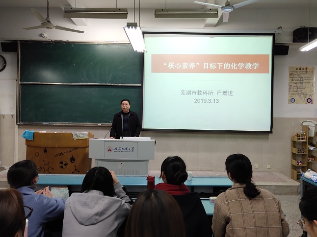 芜湖市化学教研员严增进老师通过详实的中学化学教学案例,详细阐述了化学学科核心素养下的课堂教学,通过化学试题的设计引发同学们的广泛思考,让大家能够从中体会到教评一体化的思想。最后,严老师建议大家在实习期间要善于总结,多写教学反思,既要肯定自己的优点,又要反思不足,以便为以后更好的教学打下基础。