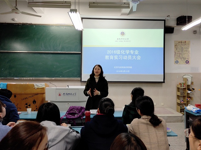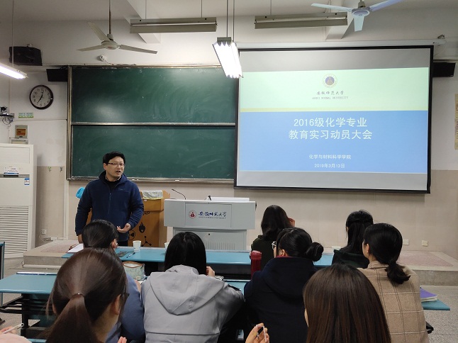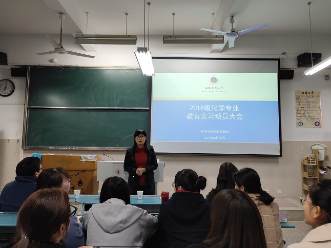 在教学楼2030103教室举行了教育实习动员大会。出席本次大会的有学院教学副院长张小俊、学院党委副书记余妍霞、部分教育实习指导教师以及2016级化学系全体师范生。会议由化学系主任阚显文教授主持。