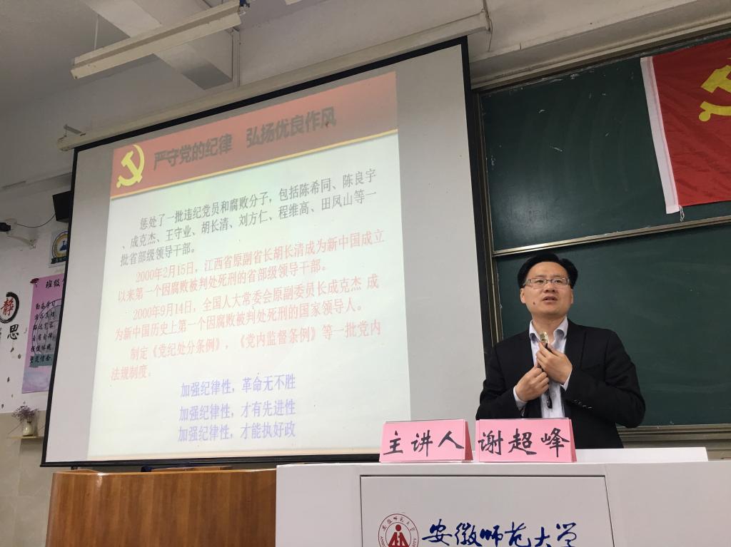 校党委组织部副部长谢超峰应邀为我院第六期党员培训班作题为“加强纪律作风建设 永葆先进性纯洁性”讲座。讲座由本期培训班班主任陶勇老师主持,党员培训班全体学员到场聆听。