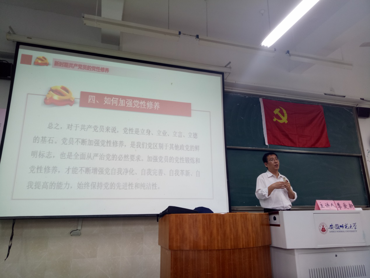 分党校 胡倩倩)为了提高党员培训班学员思想政治觉悟,使全体预备党员深入了解我党,看清我党所面临的各方面挑战,树立正确的人生观,2019年4月13日校党委常委、组织部部长季爱新应邀为全体学员们带来了《锤炼党性修养 强化使命担当》专题学习。党性,是一个政党的基本属性,源于阶梯特性而高于阶级特性,是阶级性最高、最集中的表现。自1938年刘少奇同志发表了《论共产党员的修养》后,我党就一直在强调“党性修养”。在本次授课中,季部长从“为什么要加强党性修养”、“什么是党员的党性修养”、“党性修养的主要内容”以及“如何加强党性修养”这四个维度来阐述新时期背景下的党性修养,为学生党员们开启了一扇认识和提升“党性修养”的明窗。