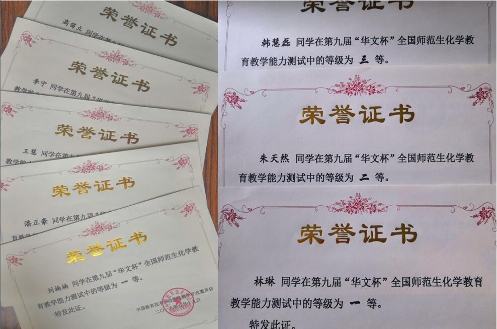赛场上,选手们以出色的表现展示了我院学子积极昂扬的精神面貌和师范生的良好素养。经过教学设计、阐述教学思路、模拟授课、现场答辩等环节的激烈角逐,最终,五名本科生的化学教育教学能力测试等级均为一等。研究生也获得了一个一等,一个二等,一个三等。