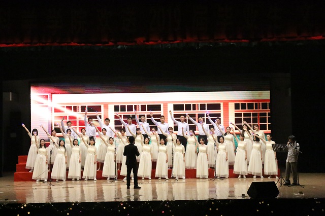 重温经典,共享芳华。院教工合唱团携歌曲《保卫黄河》震撼出演,讲台上,他们温文尔雅、授业解惑,舞台上,他们歌声优美、气势如虹,整齐的队伍、嘹亮的歌声将现场氛围推向高潮。毕业生微视频《赭是我们,化young青春》将毕业生的思绪拉回了入学之时,伴随着悦耳的《昨日青空》,将四年的点点滴滴一一叙说,让母校的温暖常伴毕业生心头。之后的《Dancing Blow》,院大艺团、毕业生代表王凡等带来的舞蹈串烧时而柔美、时而劲爆、时而活泼,引得台下观众不断喝彩,惊叫连连。
