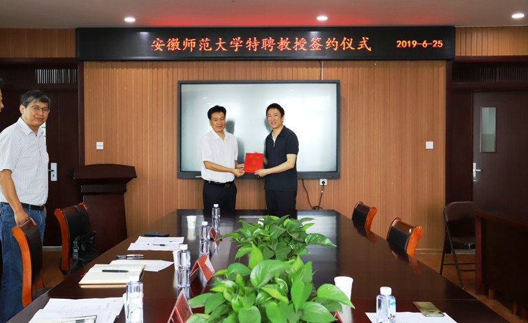 随后朱为民代表学校、商永嘉代表功能分子固体教育部重点实验室与倪劲松教授签署了特聘教授协议书。毕明福副校长向倪劲松教授颁发了聘书。