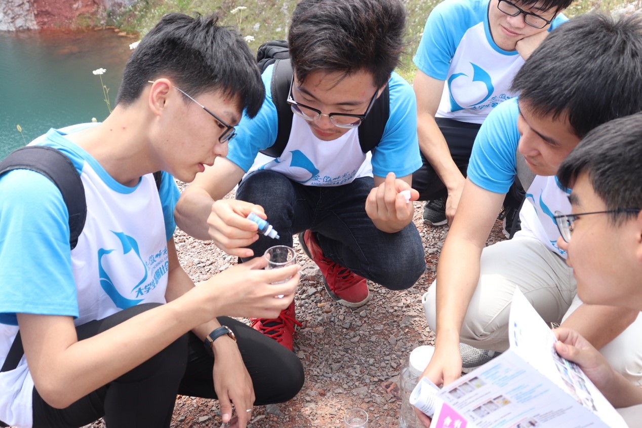 抵达蓝色网红湖后,实践团队的成员们便积极开展了各种工作。首先,成员们对网红湖的湖水进行了采样,成员们前往河边一同进行了水样的采集,由于采样当天之前几天下过雨,为了确保后期检测的可靠性,尽量选取了较深处的水样。网红湖地形较为陡峭,采样完毕后,大家便返回了湖边的平地,运用携带的实验材料进行初步实验检测。