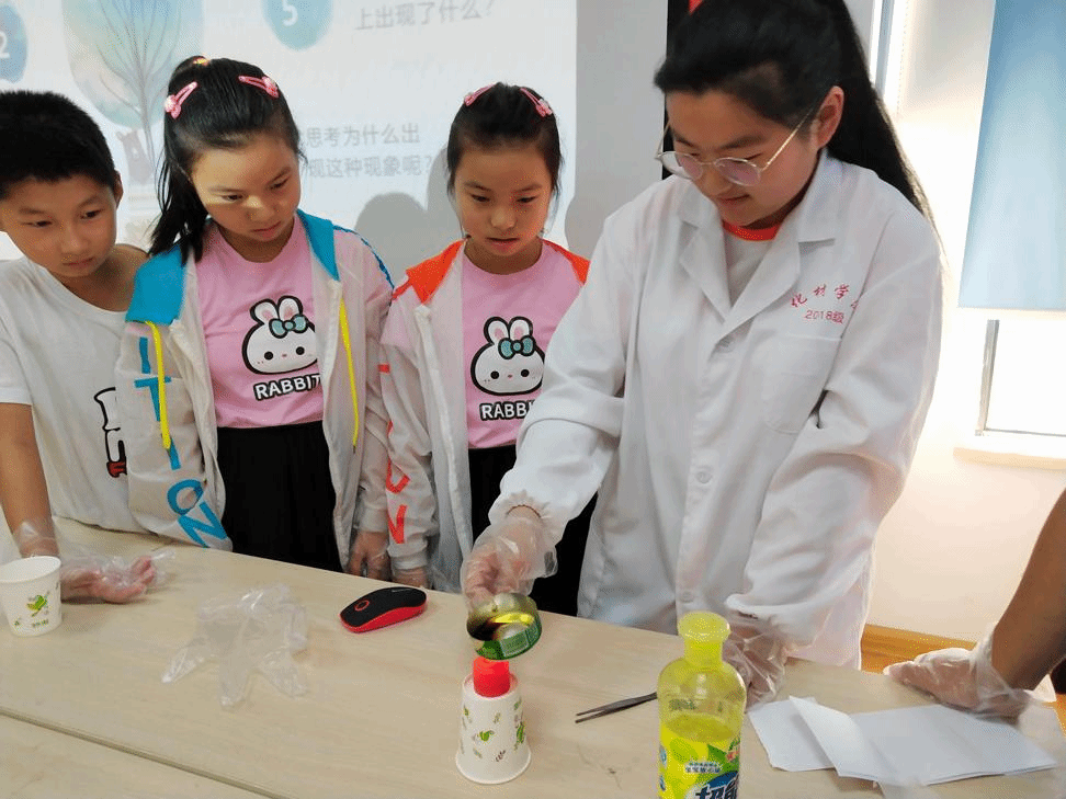 除此之外,路振龙同学带来的“烧不坏”的手帕实验,深入浅出地讲解了酒精燃烧时水蒸气对手帕的防护作用。同时教导小朋友们平时在家里不要随意玩火玩电,注意安全。唐文君同学和程文婷同学分别用“飘浮的针”和气球实验向小朋友们展示了表面张力的神奇。