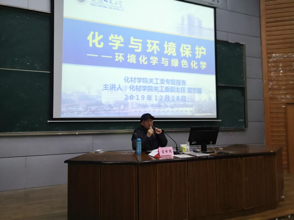 关工委副主任宫世国老师应邀在花津校区1号楼2010105教室,为2019级新生带来“化学与环境保护——环境化学与绿色化学”专题报告,报告会由院关工委秘书陶勇主持,2019级新生辅导员周冬冬、19级新生同学参加了此次讲座。
