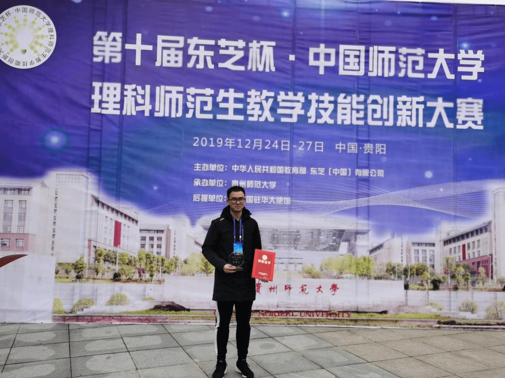 周冬冬/王磊)12月24日~27日,由教育部和东芝(中国)有限公司主办的第十届东芝杯•中国师范大学理科师范生教学技能创新大赛在贵州师范大学举行,来自全国50所师范大学的145名师范生分数学、物理、化学三组进行竞赛,每组设一等奖1名,二等奖3名,三等奖6名。决赛设有教案设计、即席演讲、模拟授课、现场提问四个环节。经过激烈角逐,我院2017级师范生王磊同学斩获得化学组三等奖,创造了我院学生在此项赛事中的最好成绩,实现我校东芝杯大赛的历史性突破。