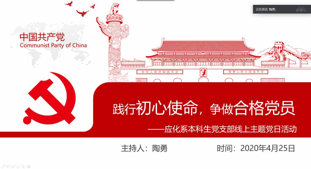 本网讯(应化系党支部 陶勇/胡倩倩为增强疫情期间党员教育管理,确保支部组织活动正常进行,4月25日20:00,应化系本科生党支部召开线上支部大会暨主题党日活动,支部全体党员参加会议,此次会议由支部书记陶勇老师主持。