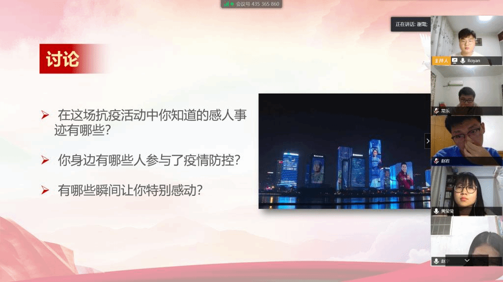 支部党员谢骜也和大家分享了他参与一线工作的感受。受母亲的影响以及看到这么多人为了这次疫情做出的牺牲,他积极报名参加了志愿活动,参加了社区的消毒、辖区卡点等工作。通过这次志愿活动,他深深地感受到中华民族是一个伟大的民族,也感受到了当代大学生的时代责任。支部其他成员张凡、赵宁、刘子豪等也发表了自己的看法与感悟。
