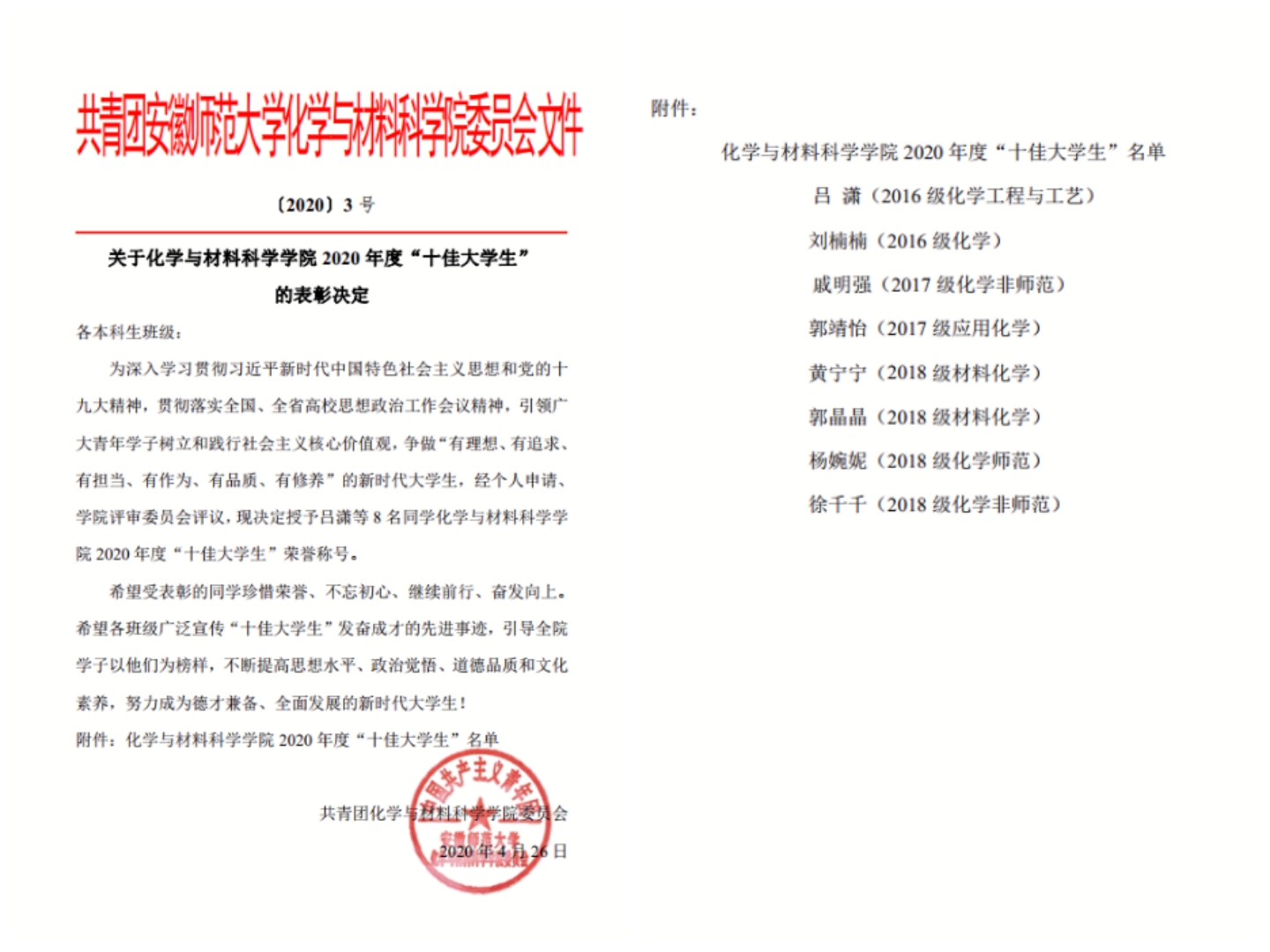 结合实际开展了院十佳大学生评选并对优秀学子进行表彰,充分利用评选活动挖掘高思想、高水平,德才兼备、全面发展的新时代大学生,并寻找发现、选树表彰一批在疫情防控工作中作出贡献的团员青年。他们从身边的事情做起:控制社区人员外出流动、为隔离的外来人员送生活用品、站在导医问诊台第一线为来看病的父老乡亲们解答问题......他们在后方尽己所能,携手抗疫。无论是积极践行社会主义核心价值观的十佳大学生,还是敢行动有担当的战“疫”青年,都是化材学子们身边的榜样。让榜样的力量引领更多青年在奋斗中成长成才,让五四精神在践行中不断传承与发扬。