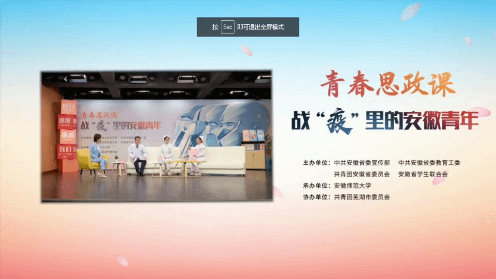 学院前期认真做好线上传播,落实宣传教育,利用官Q、官微等平台多方位地向全院师生做好预告动员工作,鼓励团员青年在主题团课中积极参与留言活动、分享心得体会。此次青春思政课采用多平台方式进行在线直播,通过短视频、青年说、微宣讲等多种形式艺术化再现课堂教学,并邀请到了各条战线上的战“疫”青年代表,听他们讲述安徽青年的战“疫”故事。课上,同学们认真观看学习了“逆时”、“速度”、“承诺”和“我们”四个课时,了解到中国新时代青年的英勇无畏的伟大精神与担当。在聆听坚守在抗击疫情一线的安徽青年群体代表的青春战“疫”故事后,同学们纷纷留言表示:要向青年榜样和医者学习,展现青春风采,绽放青春力量,不负祖国的期望,挑起振兴中华的历史重任。