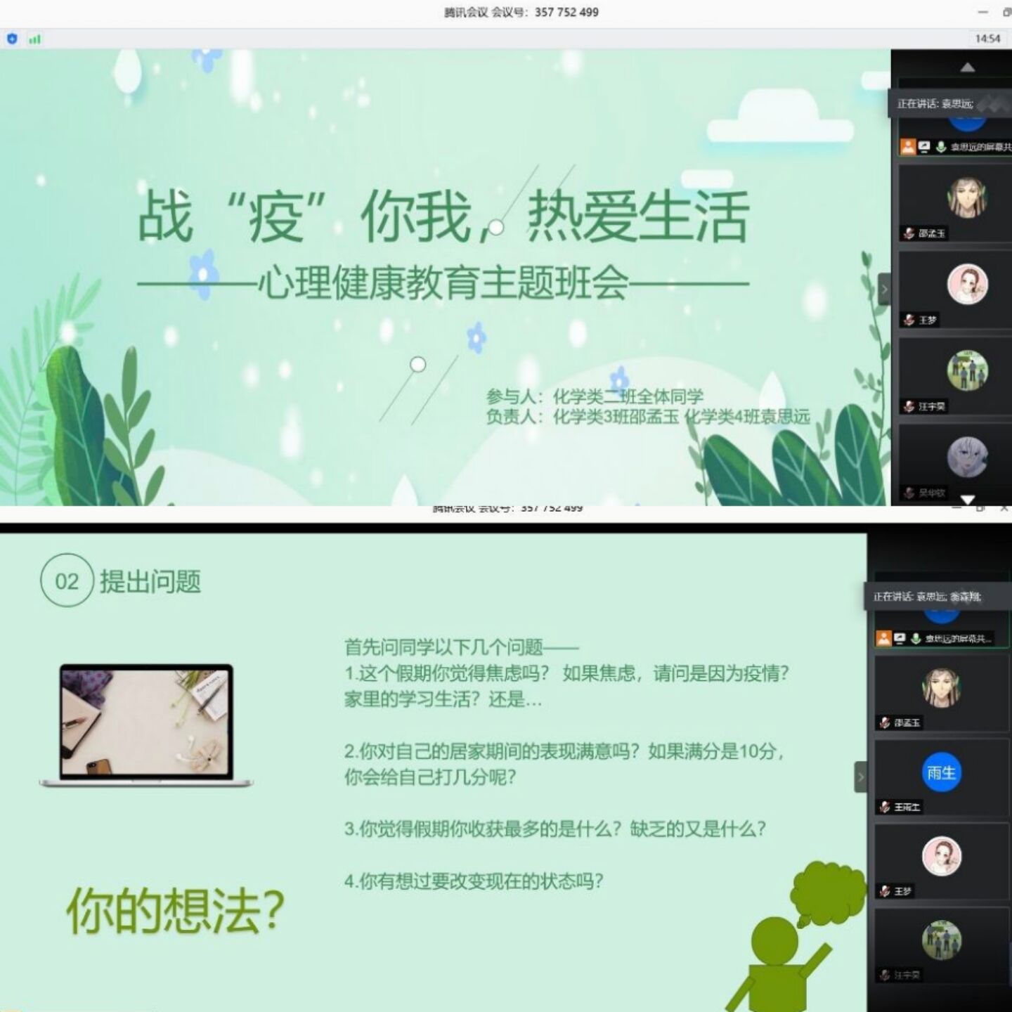 为了进一步落实发展辅导站联系服务机制,做好疏导和跟踪辅导工作,本次“5·25”心理健康月活动还在线上举行了学生干部培训会。会上,回顾梳理2019-2020学年发展辅导站的活动,提出不足之处,并再一次厘清发展辅导站职责,希望大家共同努力,携手进步。会后,我院各班心理委员陆续召开以“战‘疫’你我,热爱生活”为主题的班会,引导班级同学理解如何在疫情期间合理关注疫情以及如何正确舒缓内心压力,积极调整自己的心态,保持理性平和、健康向上、乐观开朗的心理状态,并通过线上调查问卷开展居家学生和返校学生的心理健康状况排查工作,以学生安全稳定为底线,加强疫情心理安全教育,确保我院学子以良好的心理状态度过一个特殊的战疫时期。