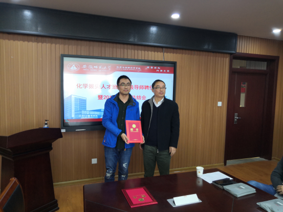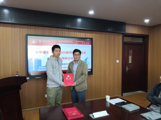 2019级导师和辅导员现场交流了过去一年指导学生过程中的经验和体会。化学系系主任阚显文向20级同学介绍了新聘导师的基本情况并公布了导师指导学生的具体分配名单。院党委书记汪俊武、院长高峰一一为新聘导师颁发聘书。