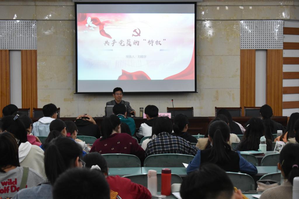 下午第二讲邀请学生处处长刘晓宇老师为学员带来《共产党人的“特权”》为主题的专题报告。首先刘老师以“和平时代党员有什么作用?”开题,引导学员思考“特权”的含义。刘老师引经据典,通过《共产党宣言》与《中国共产党》的引用,解释了共产党员的‘特权’是什么。对于共产党员的特权如何体现这一问题,刘老师节选了电视剧《人民的名义》中一名老党员为什么入党的这一片段,为学员们揭示了共产党人的“特权”特就特在“不搞特殊”;共产党人的“特权”特就特在“不给组织添麻烦”;共产党人的“特权”就是平常时候能“看得出来”,共产党人的特权就是关键时刻能“站得出来”;共产党人的“特权”就是危难关头能“豁得出来”。刘处长寄语学员,要珍惜和重视学习党的理论知识的机会,不断提高自己的政治觉悟和修养,争取早日成为一名合格的共产党员。