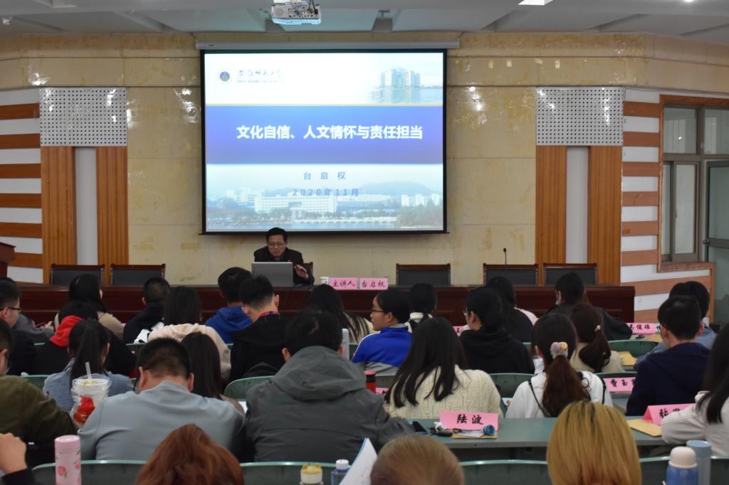 下午第一讲邀请校资产处处长台启权老师为学员带来《文化自信、人文关怀与责任担当》为主题的专题报告。首先台老师以“什么是文化?”开题,点出文化就是和人有关,而人文则是人类文化中精神文明的先进部分和核心部分,即先进的价值观及其规范。从文化引出中国的四个自信,在强调文化自信时引用十九大报告所说:“文化自信是一个国家,一个民族发展中更基本,更深远,更持久的力量,文化是一个国家,一个民族的灵魂。”台处长期盼广大青年党员有文化自信,有人文关怀,有责任担当!