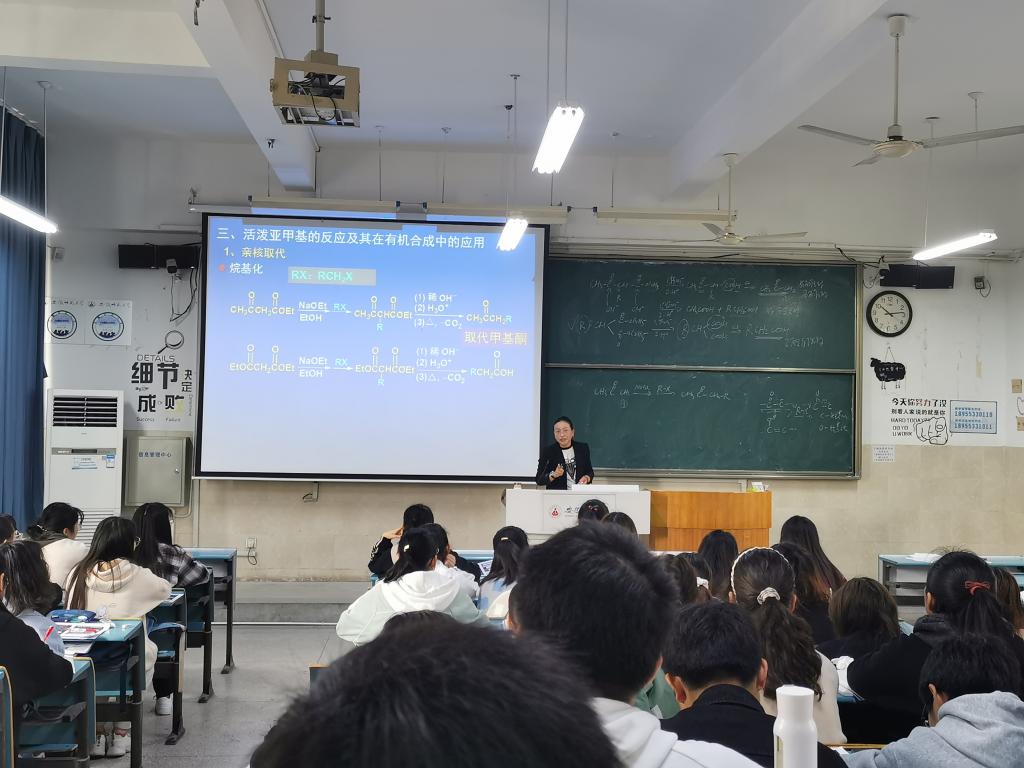 课堂上,张丽军老师首先简要回顾了上节课所学内容,使用PPT、板书等形式向同学们详细地讲解了几种亲核反应的机理以巩固所学知识,接着对比了乙酰乙酸乙酯和丙二酸二乙酯的反应并且给同学们留下了部分练习,以此激发同学们的思考。在同学们对反应有了了解之后,张丽军老师介绍了制备高级的二元甲基酮或二元乙酸和环状的甲基酮或乙酸的反应。考虑到大量的反应让同学们难以理解,张丽军老师结合了趣味故事阐述了基团的优先顺序,深入浅出,让同学们豁然开朗。最后,张丽军老师让同学们思考了一个合成例题,让同学们在回顾本节课知识的基础上发展创新能力,提高了同学们的学习自主性。
