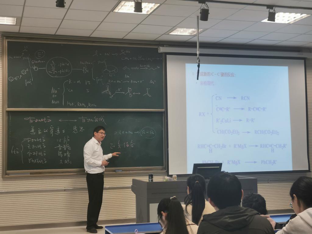 课堂上,商老师从有机合成的悠久历史谈起,为同学们揭开了有机合成的神秘面纱。紧接着他向大家介绍了在有机合成的发展历程中造福人类的一些化合物。当谈及青霉素时,商老师娓娓道来,讲述了一个丘吉尔和青霉素的发现者——弗莱明的故事,将科学历史和课堂知识得以结合,使学生对于有机合成的知识有了最基础的了解。随后,他深入浅出地介绍了有机合成的基本任务——构筑特定结构化合物,以及为得到特定的目标化合物时需要使用的一系列方法。在对理论知识进行详细讲解后,他从易到难列举并讲解了一些典型例题,让同学们不仅巩固了知识,更提升了举一反三的能力。