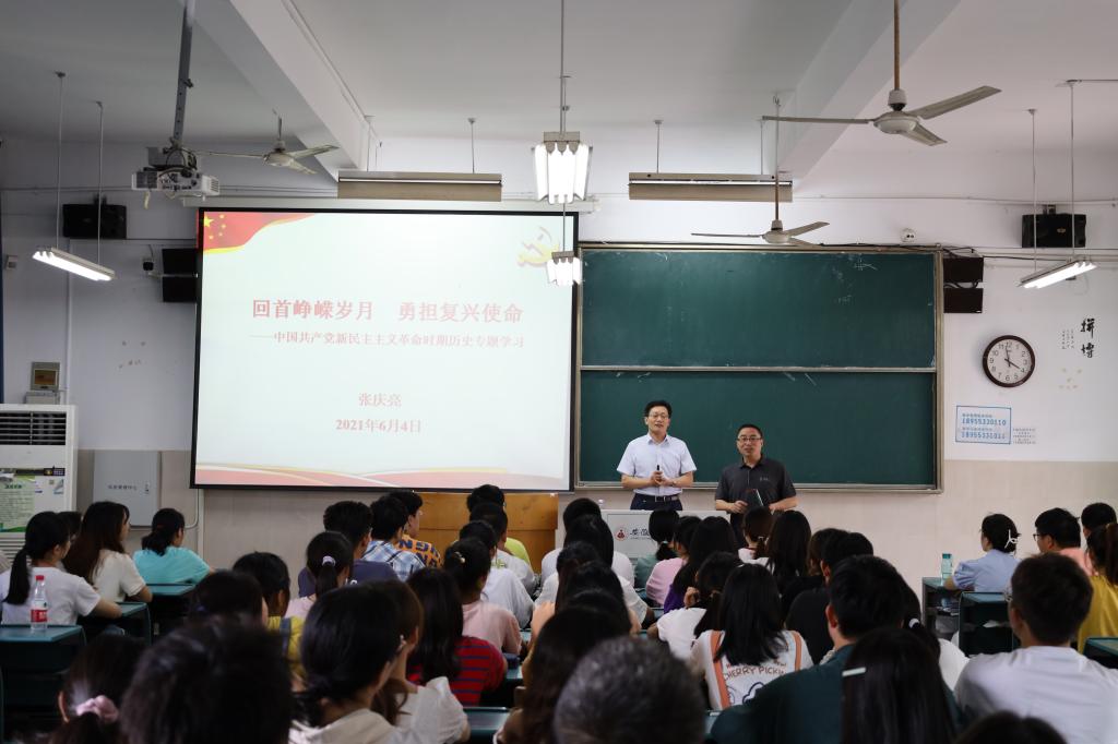 张庆亮结合长期的理论思考和实践研究,紧扣“中国共产党新民主主义革命时期历史”这一主题,从“学习中国共产党历史的重要性、中国共产党诞生的历史必然性、新民主主义革命时期党史回顾、新民主主义革命胜利及其意义”四个方面,引用大量生动形象的党史故事,带领同学们回顾了新民主主义革命时期那段峥嵘岁月。