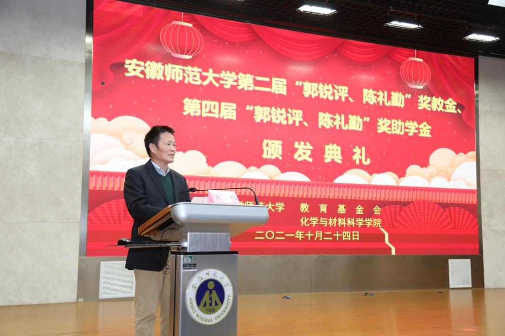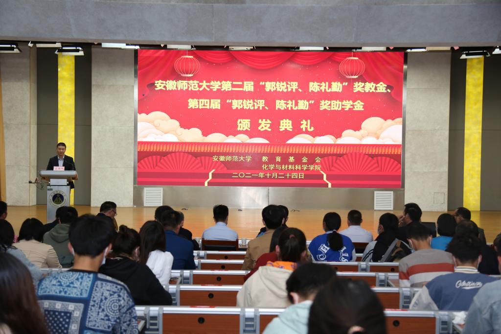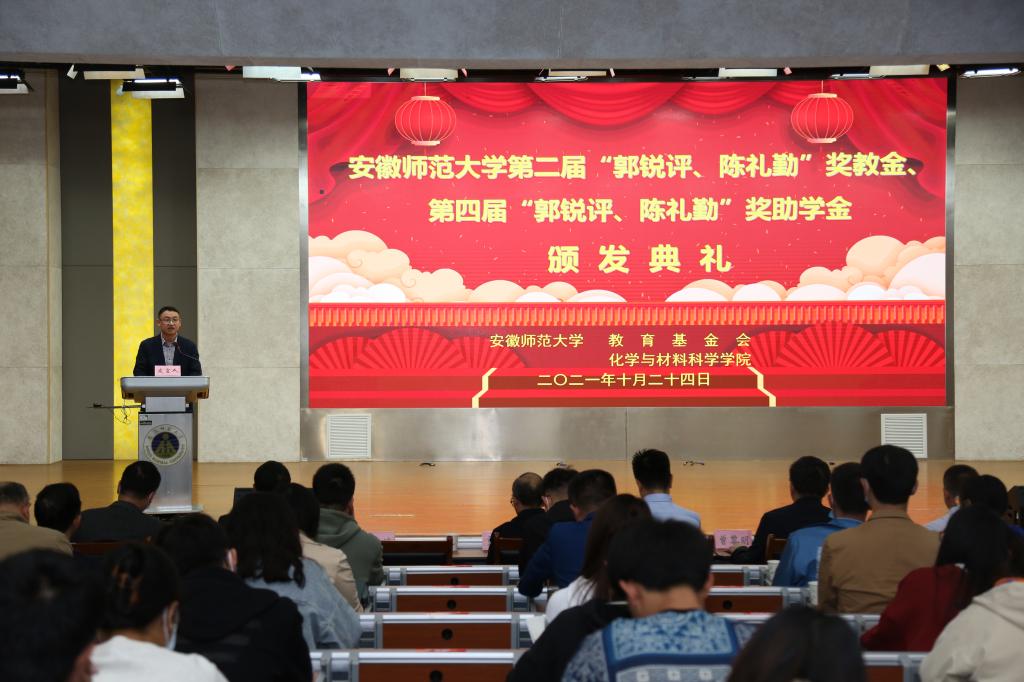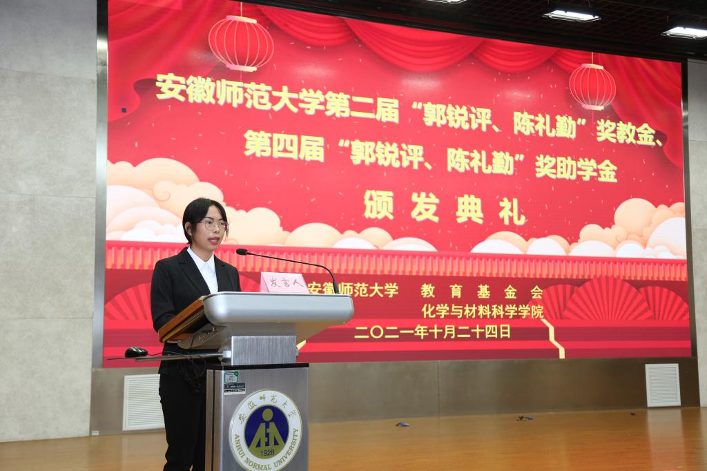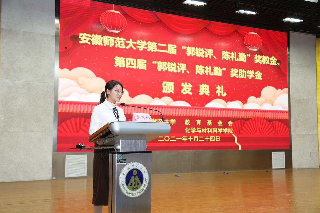 第二届“郭锐评、陈礼勤”奖教金、第四届“郭锐评、陈礼勤”奖助学金的决定》。嘉宾们分6个批次共15组向获奖师生、受助学生颁发奖教金、奖助学金获奖证书。2018级材料化学专业黄宁宁和2019级化学(师范)专业沙凝分别代表获奖、受助同学发言,两位同学对郭锐评女士、陈礼勤博士的无私资助表达了诚挚的敬意,并向学校、学院老师和同学们的关心表达了感谢。两位同学表示将怀揣感恩之心,以更加优异的成绩来回报郭锐评女士、陈礼勤博士及学校学院给予的关心和帮助,并努力将这份大爱精神传承下去,奉献爱心,回馈社会。