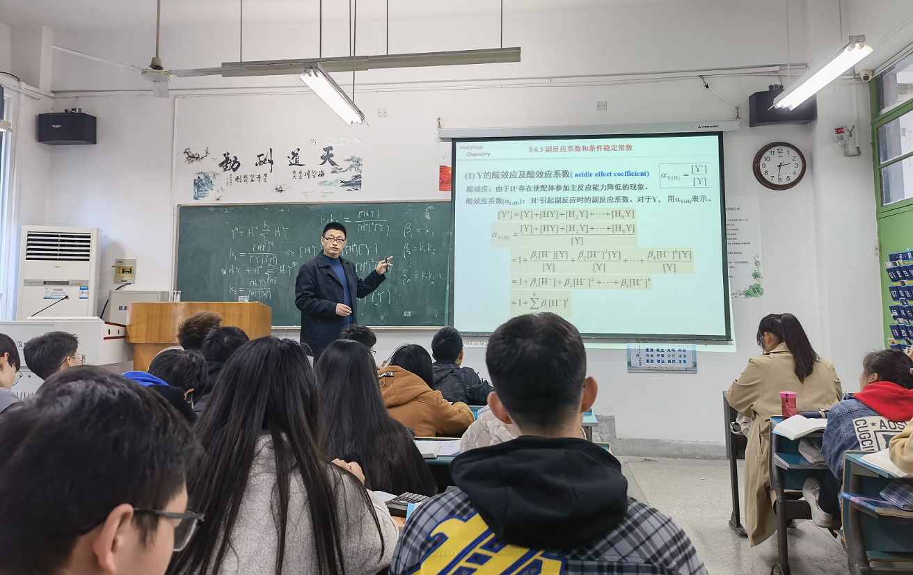 李永新老师围绕络合滴定法中“副反应系数和条件稳定常数”主题展开教学。回顾了EDTA及其金属络合物的性质等知识点后,李老师从络合滴定的主反应介绍到影响主反应进行的一系列副反应;为考察副反应对主反应的影响程度,重点介绍了副反应系数的概念。接着他以酸效应为例,详细讲解了酸效应系数的定义式,分析了式中不同浓度的表达和相互之间的关联,进而推导了酸效应系数的通式。为了让同学更加透彻地理解,李老师将所讲知识点与例题相结合,带领学生一起讨论不同络合剂引起的酸效应及其系数的计算,促进了学生对所学知识的理解和应用。整个教学过程目标明确,思路清晰,讲解详细,简明扼要,师生课后反映效果良好。