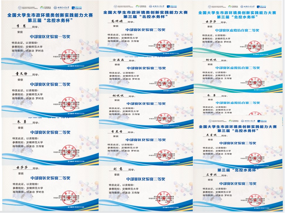 全国大学生市政环境类创新实践能力第三届“北控水务杯”大赛分为地区选拔赛、决赛。地区选拔赛竞赛内容包含化验赛和虚拟仿真赛,地区选拔赛为线上选拔。其中化验赛为重铬酸钾法测定水中化学需氧量,采用视频录制的方式展开,即将实验全过程视频剪辑成不超过5min的短视频;虚拟仿真赛包括“水污染控制工程”和“水质检测”两类虚拟仿真赛项。我校对此高度重视,认真准备,最终取得优秀成绩。其中,李慧同学获得化验赛一等奖,胡悦悦、高旖婧、朱勇、涂晶晶、童文静、云莎莎同学获得化验赛二等奖,刘意、吴星悦、李晨希、左梦琪同学获得化验赛三等奖,胡悦悦、云莎莎同学获虚拟仿真赛二等奖,朱勇同学获虚拟仿真赛三等奖。许发功、罗时忠、王伟智三位老师获优秀指导教师称号。许发功,罗时忠分别荣获全国大学生市政环境类创新实践能力第二届、第三届“北控水务杯”金牌裁判称号。