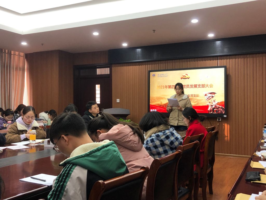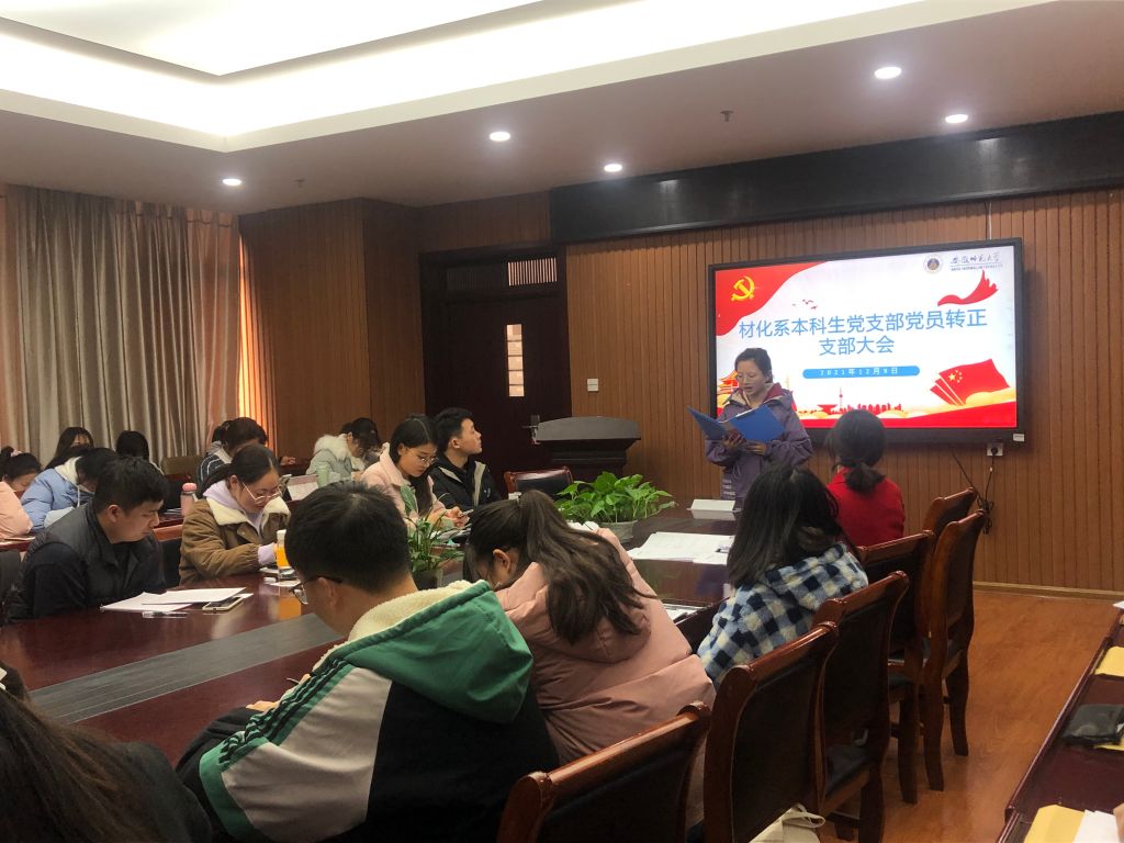 材化系本科生党支部在礼勤楼702会议室举行了2021年第四批次党员发展支部大会。本次大会由党支部书记王芳同志主持,材料化学专业18级辅导员陶勇、19级辅导员陈静和材化系本科生党支部全体党员及发展对象共同参加此次会议。