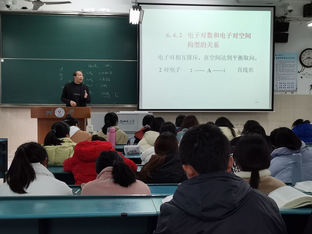 王正华老师从“中心价层电子的总数和对数”、“电子对数和电子对空间构型的关系”、“分子构型和电子对空间构型的关系”、“多重键的处理”、“影响键角的因素”等方面讲解价层电子对互斥理论,课堂讲授通俗易懂、深入浅出、内容充实、重难点突出,同学们在课堂中认真听讲、积极发言,对微观结构有了进一步了解。