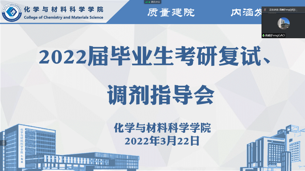 凌从祥首先为全体同学介绍了今年的复试政策,随后就调剂具体流程与注意事项作了详细解读,帮助全体考研同学对后期调剂工作有了更充分的了解。随后,副院长周双六建议调剂的同学要适当降低调剂期望值,以复试成功为主要目标;复试时要注意个人言行举止,提前锻炼个人语言表达能力;对自己报考专业的研究方向要提前了解并做好准备。院长高峰对同学们取得的成绩表示了祝贺,随后结合当前考研的现实形势,鼓励大家要把握住复试机会,高度重视,积极准备;对待复试的方向要有扎实的学科基础,掌握技巧,最大程度表现出自己水平。他希望学生能多渠道、多形式的收集信息,主动与填报院校的指导老师沟通。鼓励达线但未能入围复试的同学,积极调剂,不要放弃。