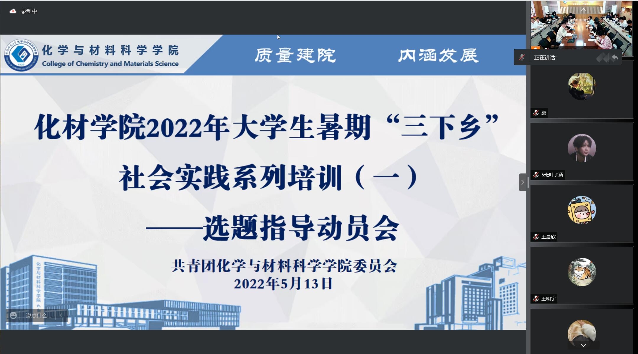 于5月13日晚上七点在礼勤楼707会议室,以线上、线下相结合的形式召开了2022年暑期社会实践选题指导动员会。学院党委副书记李古州、团委书记陶勇、全体辅导员出席本次会议,2020、2021级部分学生线上线下参加此次会议,会议由院团委学生副书记吴泓婧主持。