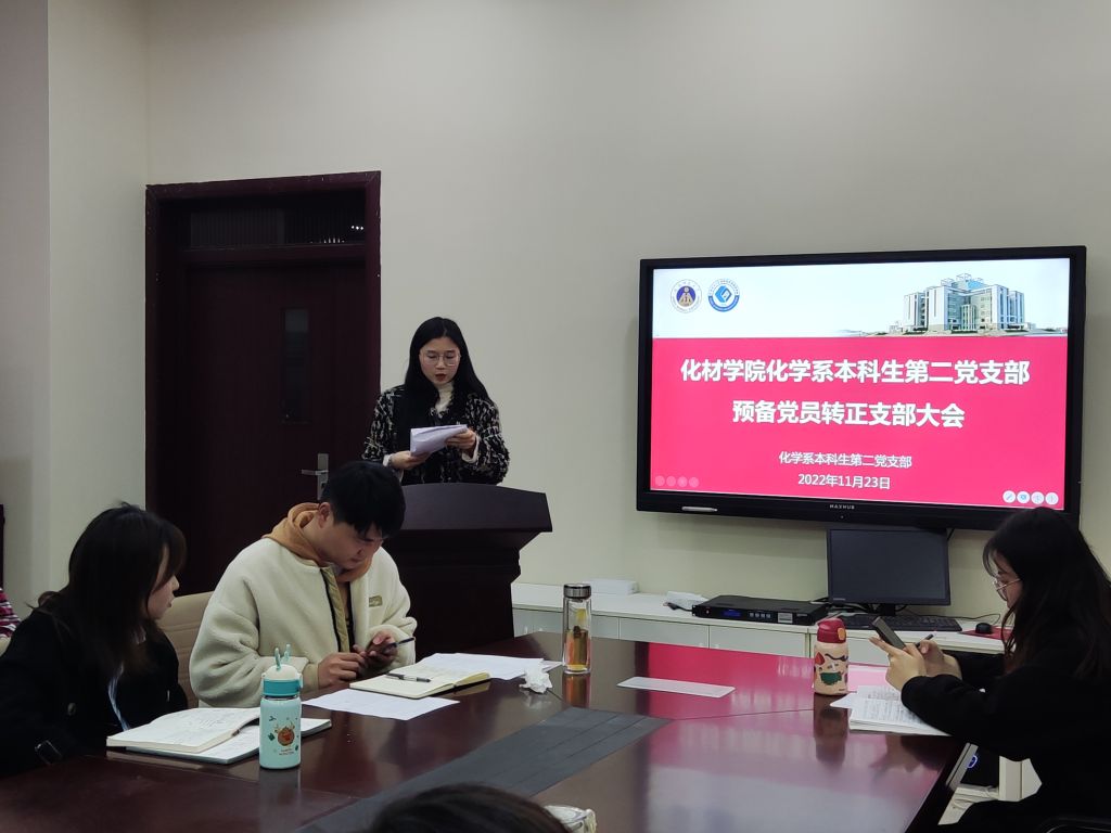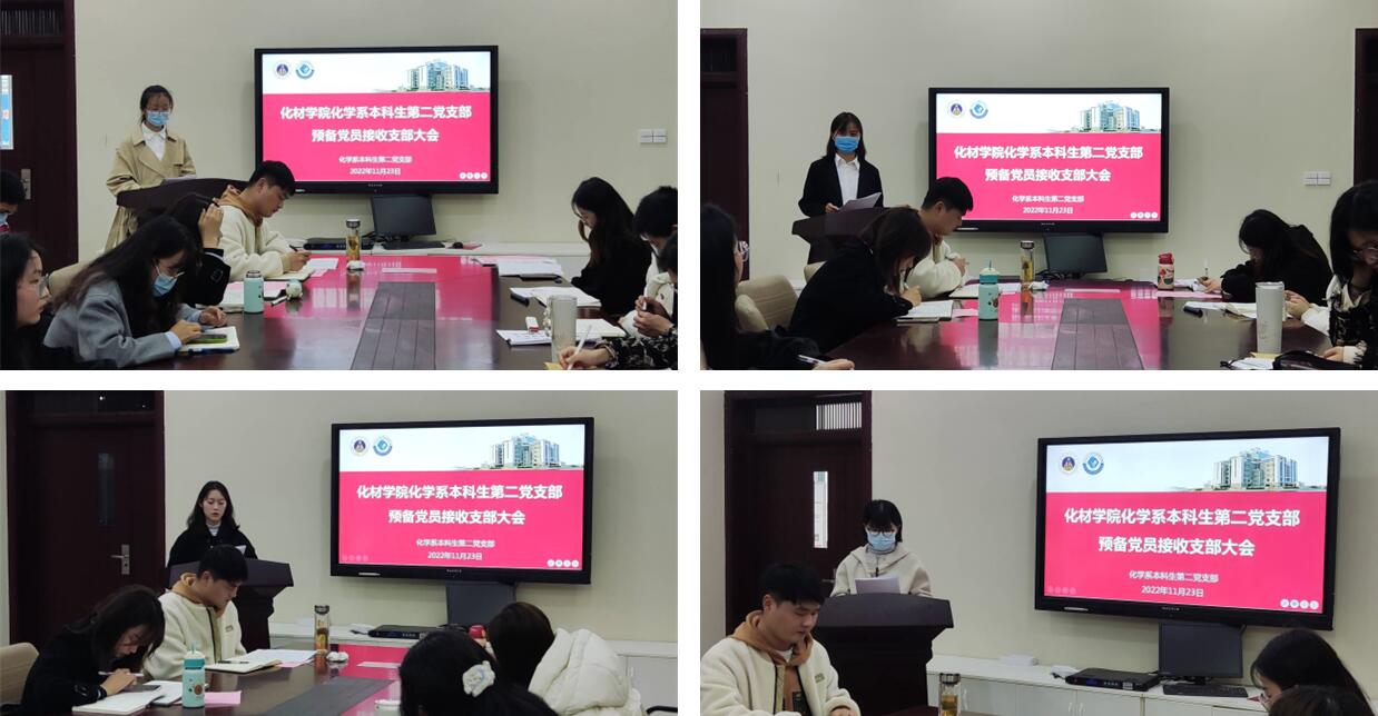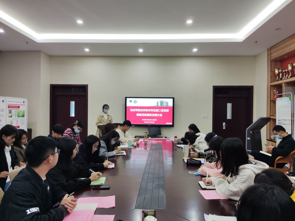化学系本科生第二党支部在礼勤楼201会议室召开发展党员大会,讨论支部委员调整,接收林曦等7名同志为中共预备党员,讨论周昱晨同志按期转正相关事宜。会议由党支部书记陶勇同志主持,